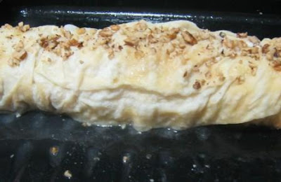 Daha sonra didiklenmiş ve cevizle karıştırılmış tavuklar yayılır. Yufkalar kenardan başlayarak parçalamadan rulo yapılır. Üstüne yumurta sürülür, ceviz serpilir. 170 derece ısıtılmış fırında pişirilir ve sıcak servis yapılır.